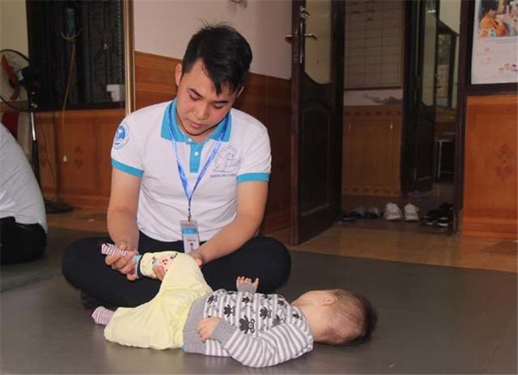 Vũ Hải Tùng - Chủ nhiệm CLB Blouse trắng Trường ĐH Vinh trong một buổi tập vật lí trị liệu cho bé bị khiếm khuyết vận động.