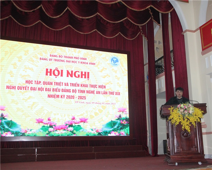 Sáng ngày 9/1, Đảng ủy trường ĐHYK Vinh tổ chức Hội nghị học tập, quán triệt Nghị quyết Đại hội đại biểu Đảng bộ tỉnh lần thứ XIX, nhiệm kỳ 2020 – 2025 với sự tham dự của đây đủ đảng viên trong toàn Đảng bộ. Về dự và báo cáo tại hội nghị có đồng chí Nguyễn Quang Vinh – P. Trưởng ban tuyên giáo Thành ủy Vinh.