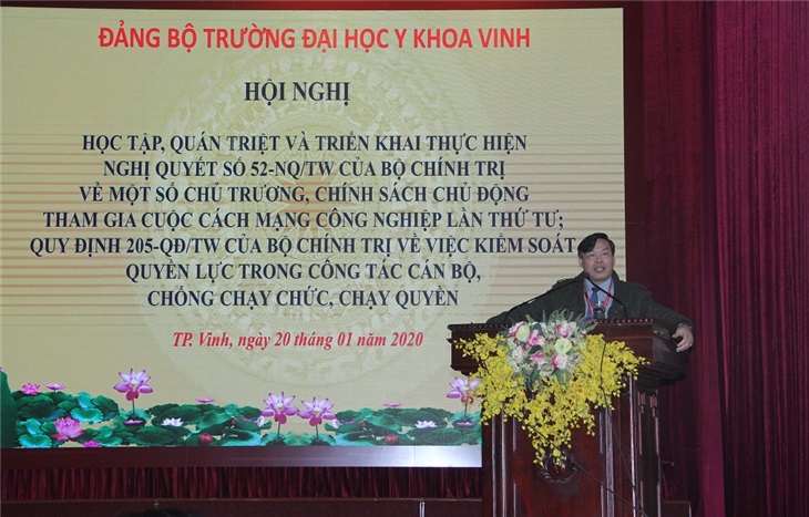 Sáng ngày 20.1.2020, Đảng bộ trường Đại học Y khoa Vinh đã tổ chức Hội nghị học tập, quán triệt và triển khai thực hiện Nghị quyết số 52-NQ/TƯ của Bộ Chính trị về một số chủ trương, chính sách chủ động tham gia cuộc cách mạng công nghiệp lần thứ tư; Quy định 205-QĐ/TW của Bộ Chính trị về việc kiểm soát quyền lực trong công tác cán bộ, chống chạy chức, chạy quyền với sự tham gia đầy đủ của các đảng viên trong toàn Đảng bộ.
