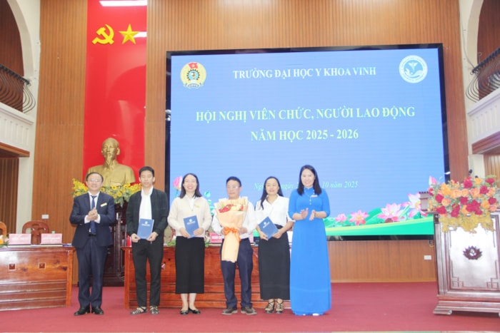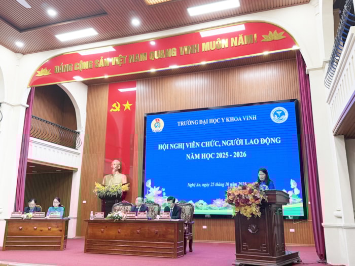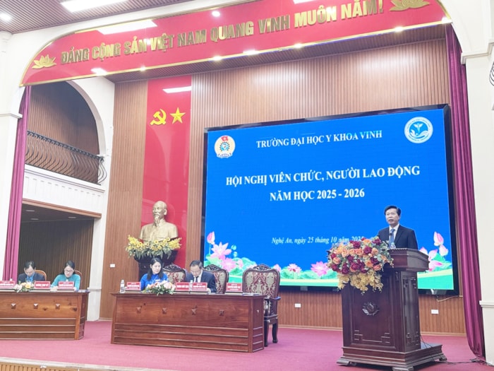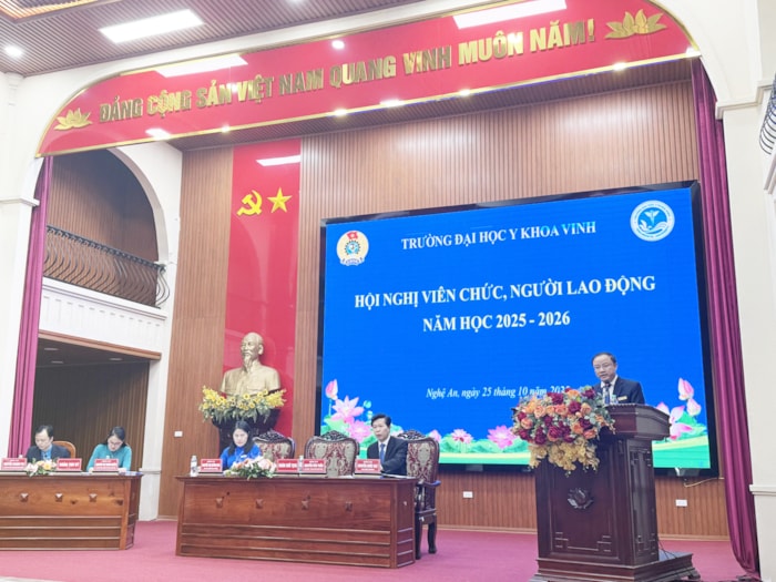 Sáng ngày 25/10/2025, Trường Đại học Y khoa Vinh đã tổ chức Hội nghị viên chức, người lao động nhằm đánh giá những kết quả đã đạt được trong năm học vừa qua và xác định những nhiệm vụ trọng tâm của năm mới (2025-2026). Là hoạt động thường niên nhằm duy trì và đảm bảo thực hiện tốt quy chế dân chủ cở sở; tăng cường phát huy quyền làm chủ của cán bộ viên chức nhà trường trong xu thế tự chủ mới; đặc biệt, hội nghị là diễn đàn trao đổi thảo luận công khai, minh bạch góp phần thể hiện và nâng cao trách nhiệm của người đứng đầu cơ quan, đơn vị; tất cả đều hướng tới mục tiêu xây dựng Nhà trường ngày càng phát triển.