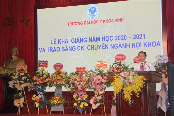 Trong diễn văn khai mạc buổi lễ, PGS.TS. Nguyễn Cảnh Phú - Bí thư Đảng ủy, Hiệu trưởng nhà trường - gửi lời chúc mừng, lời cảm ơn gần 1000 tân sinh viên đã nỗ lực vượt khó trong kì thi nhiều thử thách vừa qua để trở thành thành viên của ngôi trường có bề dày truyền thống 60 năm lịch sử, và “hi vọng mái trường ĐHYK Vinh sẽ là nơi trải nghiệm những năm tháng đẹp đẽ nhất của tuổi thanh xuân và khởi đầu thuận lợi cho sự nghiệp của các em”, đồng thời căn dặn các em hãy cố gắng học tập, trau dồi kiến thức, kỹ năng để khẳng định bản thân, tích lũy kiến thức hành trang cho tương lai. Nhán dịp này, thay mặt lãnh đạo và tập thể CBGV nhà trường, Hiệu trưởng Nguyễn Cảnh Phú đã trao Giấy khen và học bổng trị giá tương đương học phí 01 học kì cho 6 bạn đạt thủ khoa kì thi tuyển sinh chính quy năm 2020.