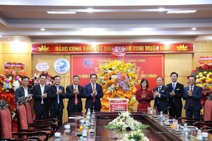 Sáng ngày 19/11/2025, trong không khí vui mừng, rộn rã ngày Nhà Giáo Việt Nam (20/11/1982-20/11/2025), Đại học Y khoa Vinh vinh dự và tự hào chào đón đồng chí Võ Trọng Hải – Phó Bí thư Tỉnh ủy, Chủ tịch UBND tỉnh Nghệ An – cùng đại diện lãnh đạo các Sở GD&ĐT, Sở Tài Chính, Sở Nội vụ,... và các đơn vị khác trong đoàn tới thăm và chúc mừng nhà trường trong ngày lễ lớn.