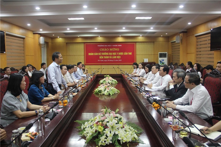 Sau khi nghe phần giới thiệu về trường do PGS.TS. Cao Trường Sinh – P. Hiệu trưởng, Giám đốc Bệnh viện trường ĐHYK Vinh – trình bày, PGS.TS. Nguyễn Trung Kiên - Hiệu trưởng trường ĐHYD Cần Thơ – nhận định hai trường có nhiều điểm tương đồng về lịch sử, định hướng phát triển,nguồn nhân lực và hết sức cởi mở khi chia sẻ về kinh nghiệm mở rộng đào tạo sau đại học theo hướng tiếp cận và đồng hành cùng Sở Y tế trong việc rà soát đáp ứng nhân lực cơ sở địa phương.