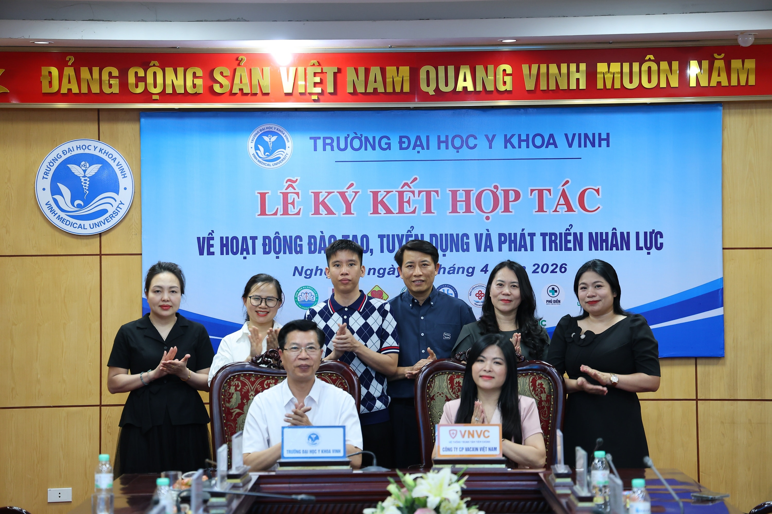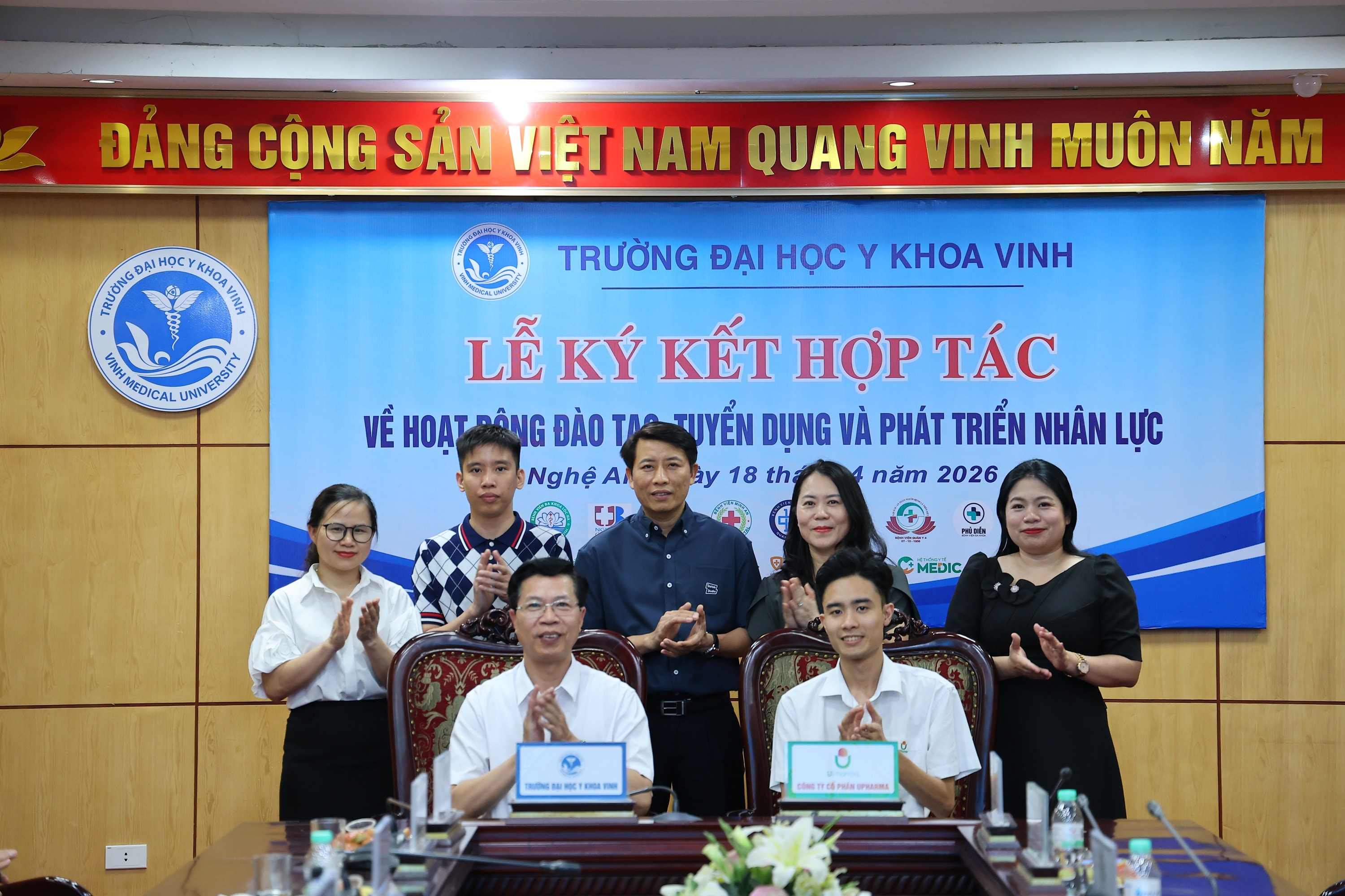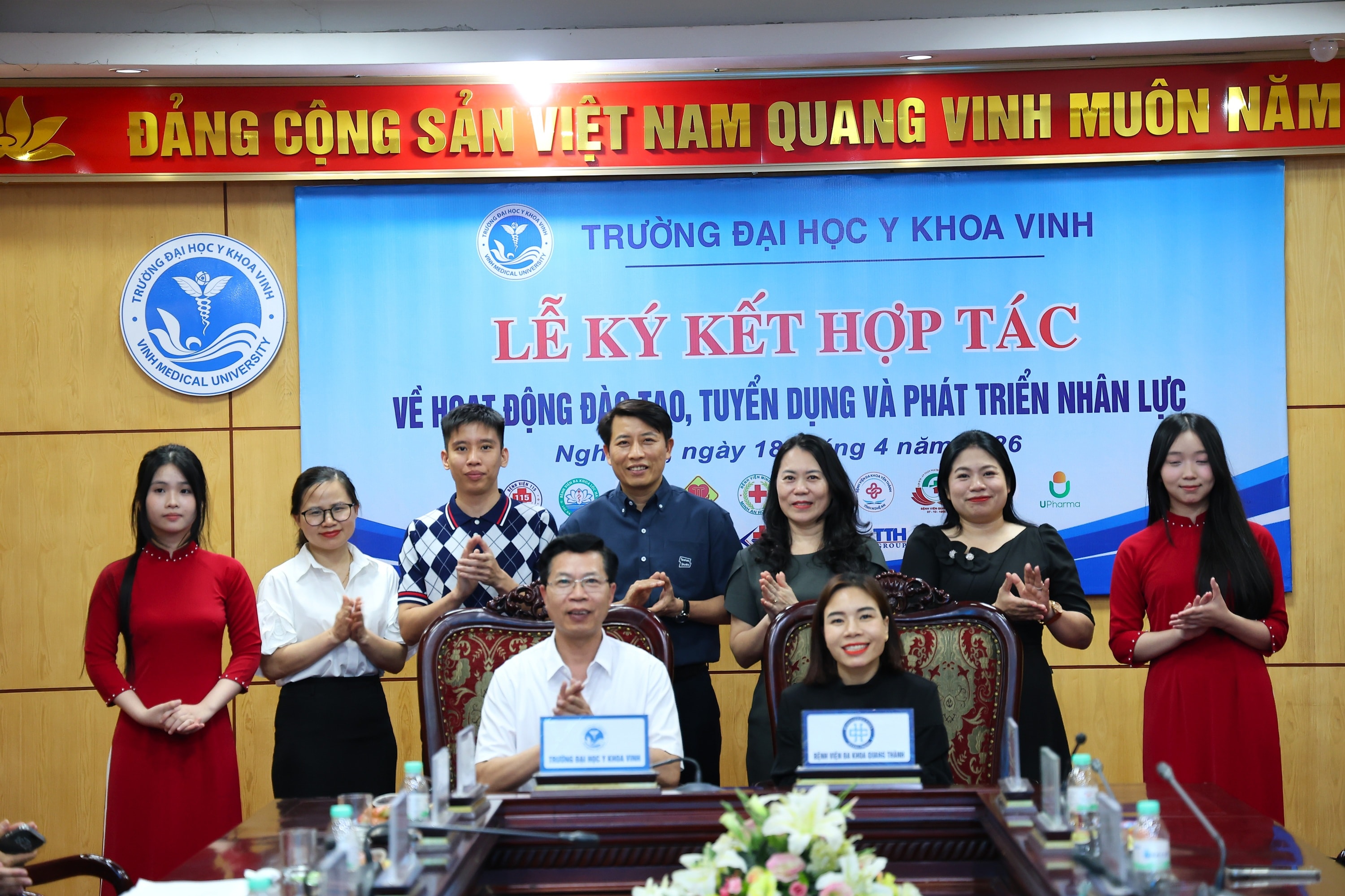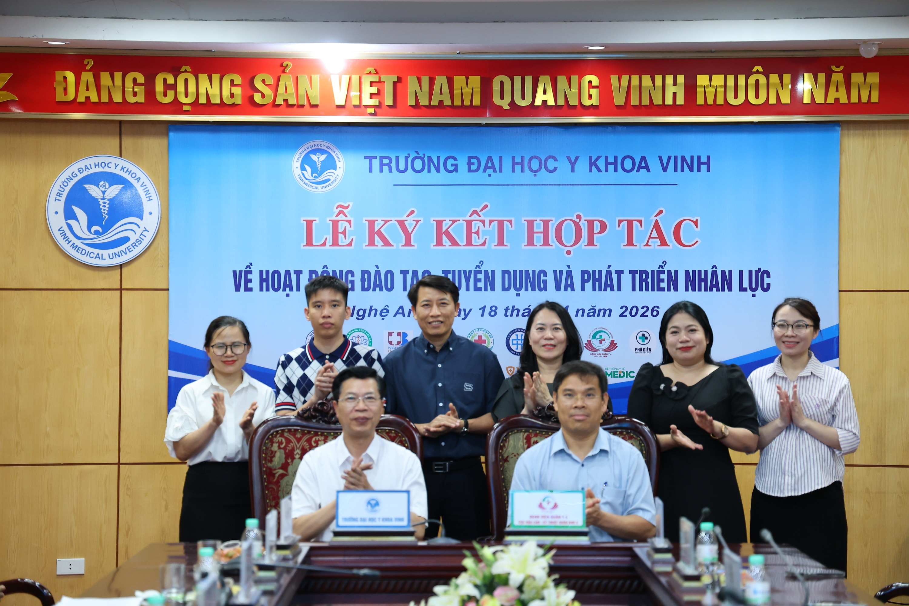 Chiều ngày 18/4, trong khuôn khổ chương trình Ngày Hội Việc làm năm 2026; trường Đại học Y khoa Vinh đã tổ chức lễ Ký kết hợp tác về hoạt động đào tạo, tuyển dụng và phát triển nhân lực với các đơn vị tham gia ngày hội năm nay.