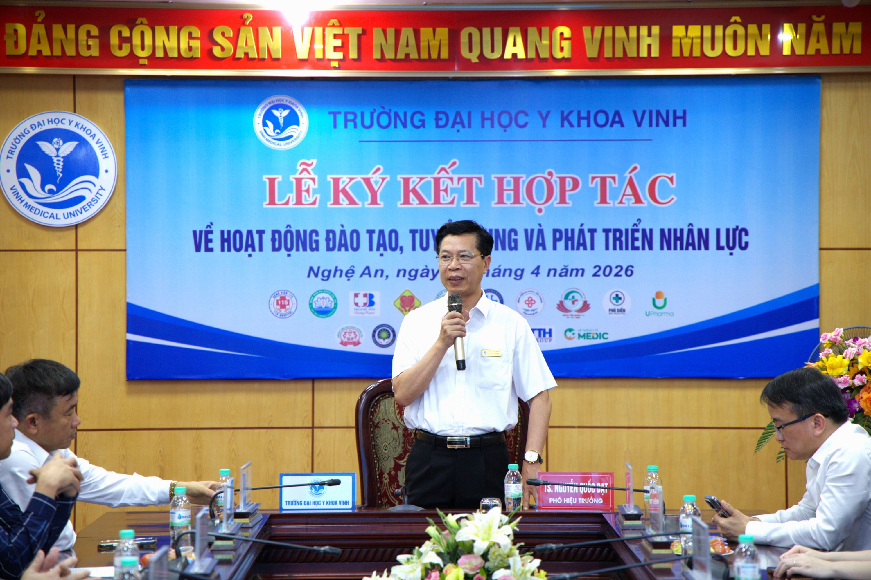 Chủ trì buổi lễ, đại diện Nhà trường, Phó Hiệu trưởng TS. Nguyễn Quốc Đạt gửi lời chào đón nồng nhiệt tới đại diện lãnh đạo các đơn vị bệnh viện trong và ngoài công lập, các tổ chức kinh doanh hoạt động trong lĩnh vực y tế đặc thù, đã dành sự quan tâm, ủng hộ, lựa chọn Đại học Y khoa Vinh là đơn vị cung ứng nhân lực cho hoạt động chuyên môn của mình.