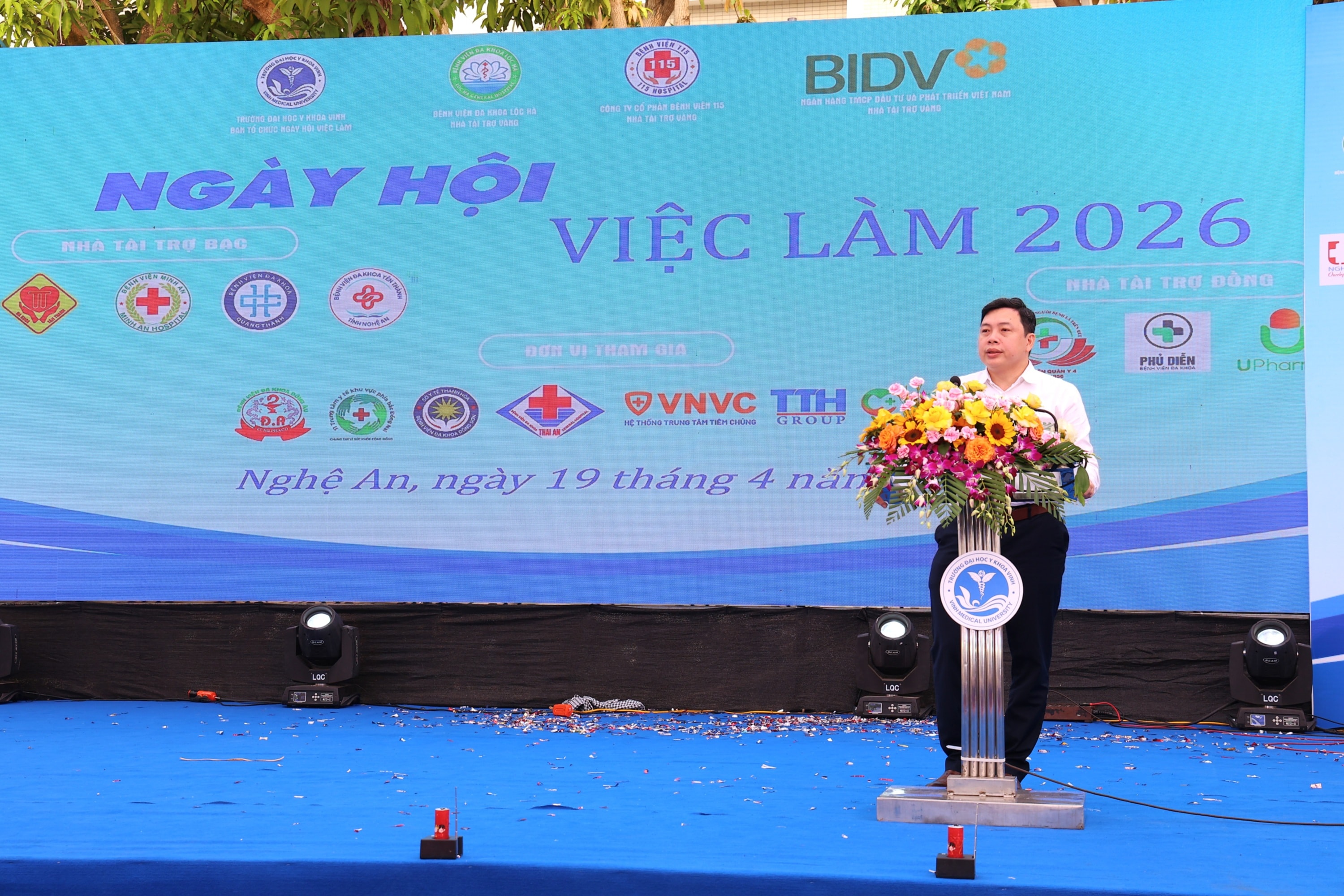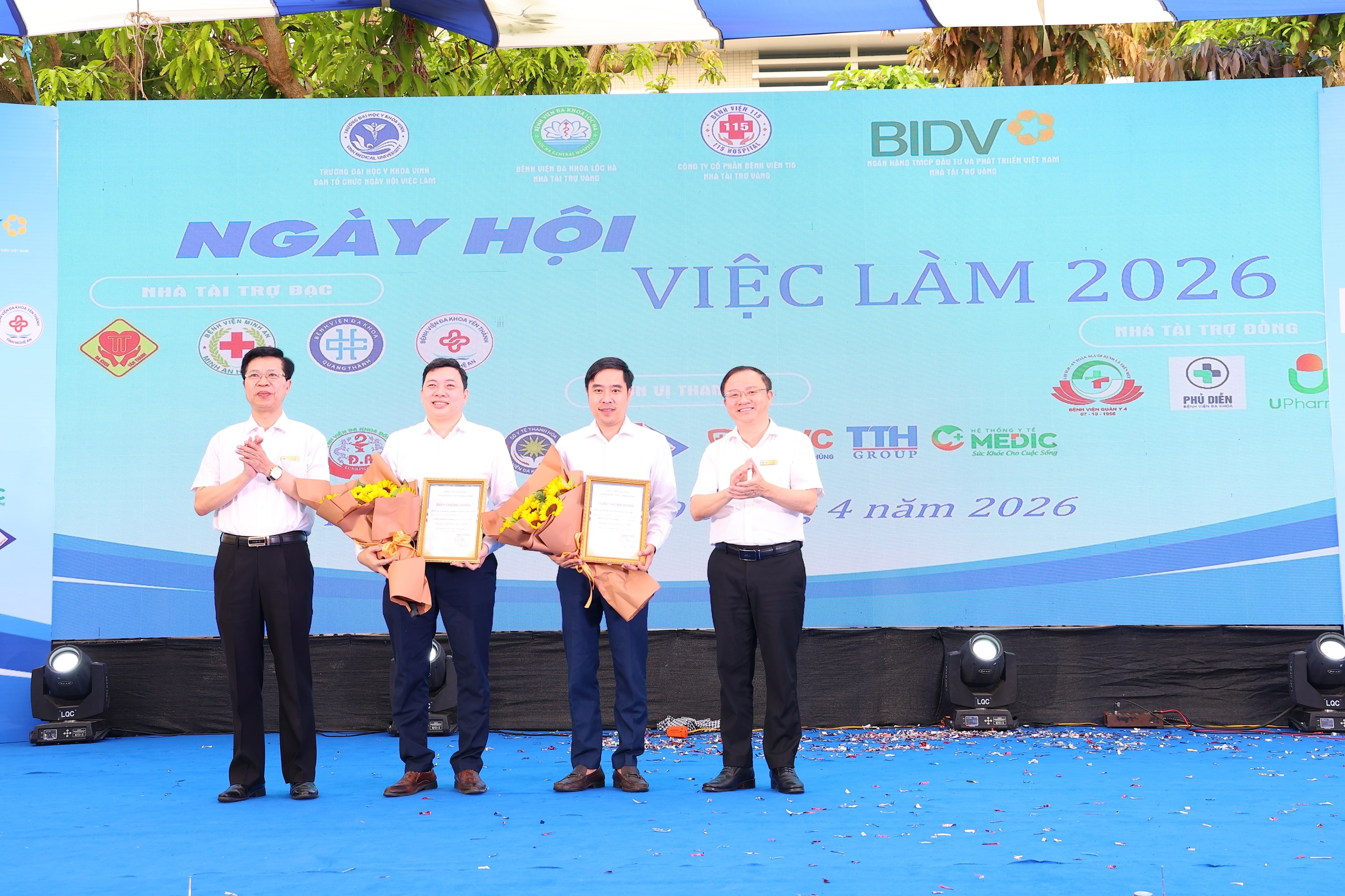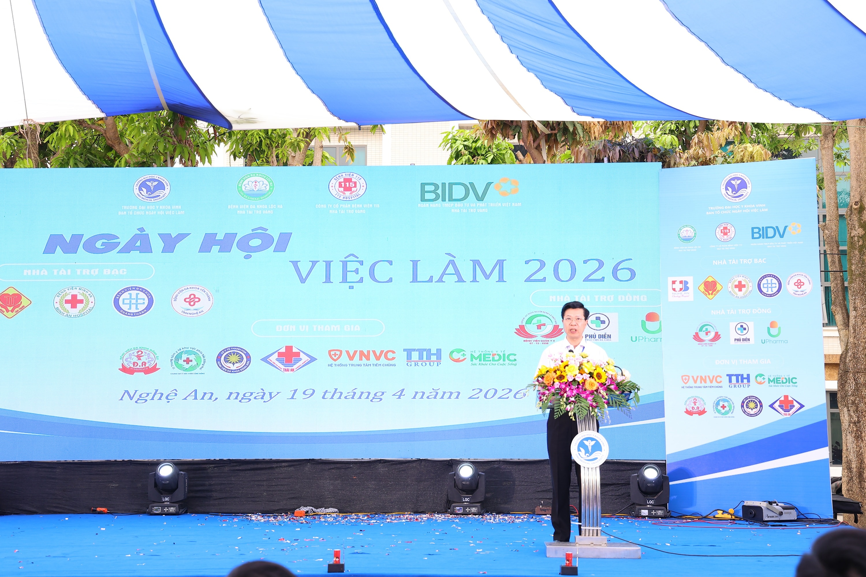 Sáng ngày 19/4, trường Đại học Y khoa Vinh đã khai mạc chương trình Ngày Hội Việc làm năm 2026 với sự tham gia của 18 đơn vị bệnh viện và tổ chức kinh doanh thuộc lĩnh vực y tế trong và ngoài tỉnh. Về phía Nhà trường, có PGS.TS. Nguyễn Văn Tuấn – Bí thư Đảng ủy, Hiệu trưởng, Giám đốc bệnh viện trường, TS. Nguyễn Quốc Đạt – P.Hiệu trưởng; đại diện lãnh đạo các khoa/phòng/trung tâm, cán bộ giảng viên và hơn 1000 sinh viên cùng tham dự ngày lễ quan trọng này.