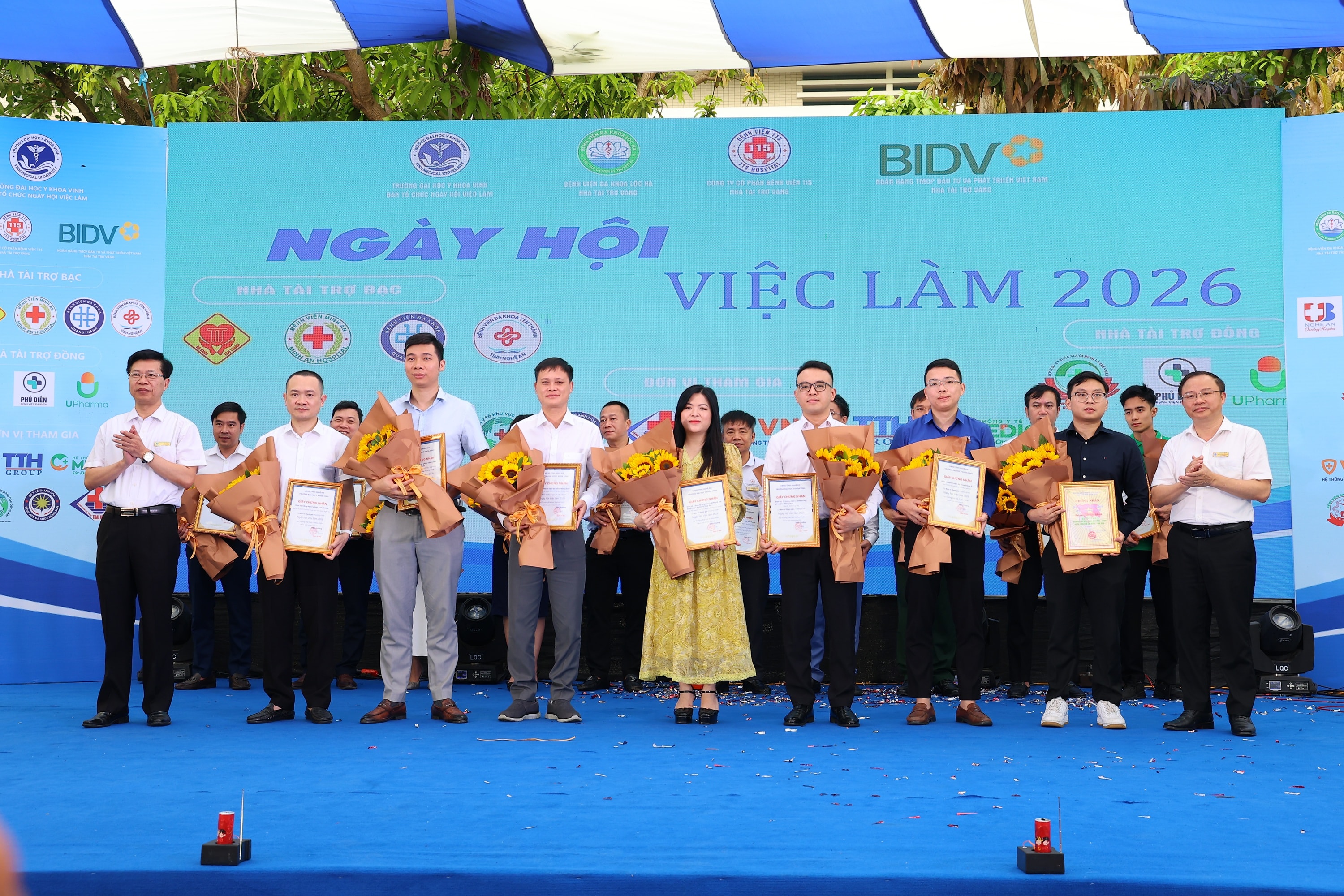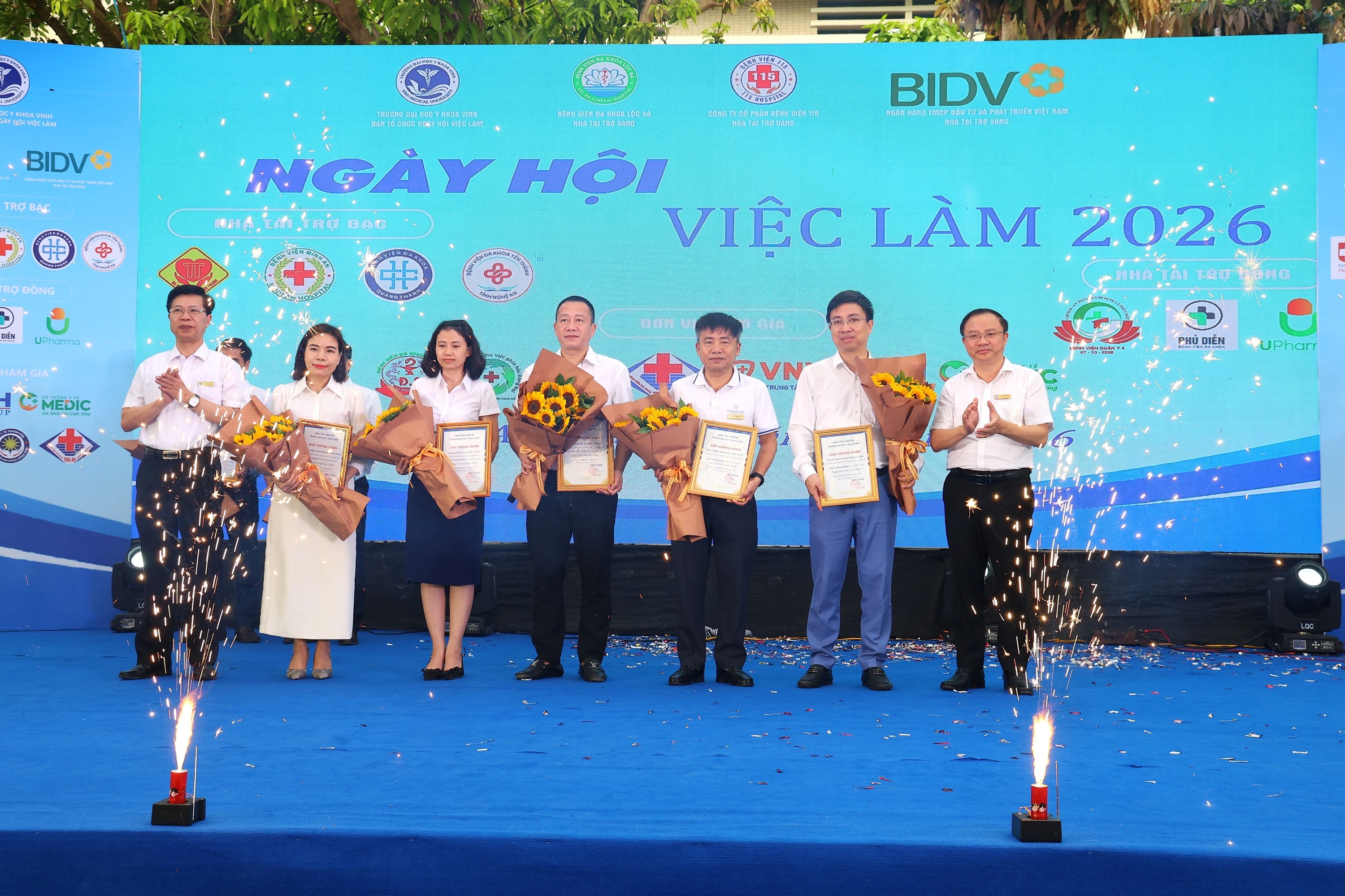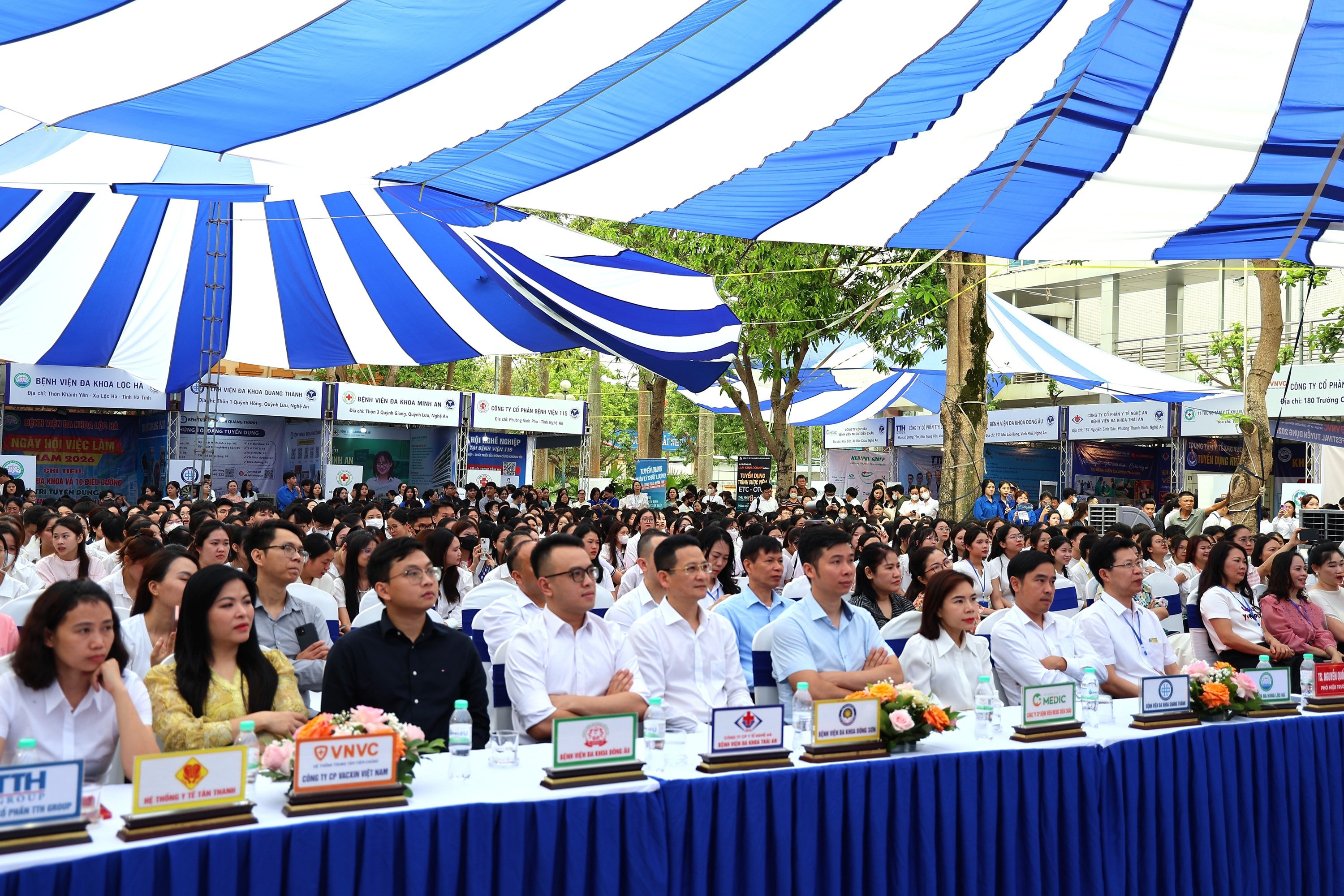 Sáng ngày 19/4, trường Đại học Y khoa Vinh đã khai mạc chương trình Ngày Hội Việc làm năm 2026 với sự tham gia của 18 đơn vị bệnh viện và tổ chức kinh doanh thuộc lĩnh vực y tế trong và ngoài tỉnh. Về phía Nhà trường, có PGS.TS. Nguyễn Văn Tuấn – Bí thư Đảng ủy, Hiệu trưởng, Giám đốc bệnh viện trường, TS. Nguyễn Quốc Đạt – P.Hiệu trưởng; đại diện lãnh đạo các khoa/phòng/trung tâm, cán bộ giảng viên và hơn 1000 sinh viên cùng tham dự ngày lễ quan trọng này.