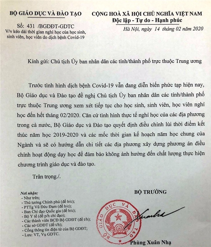Công văn nêu rõ, trước tình hình dịch bệnh COVID - 19 vẫn đang diễn biến phức tạp, Bộ Giáo dục và Đào tạo (GD&ĐT) đề nghị Chủ tịch UBND các tỉnh, thành phố xem xét tiếp tục cho học sinh, sinh viên, học viên nghỉ học đến hết tháng 2/2020.