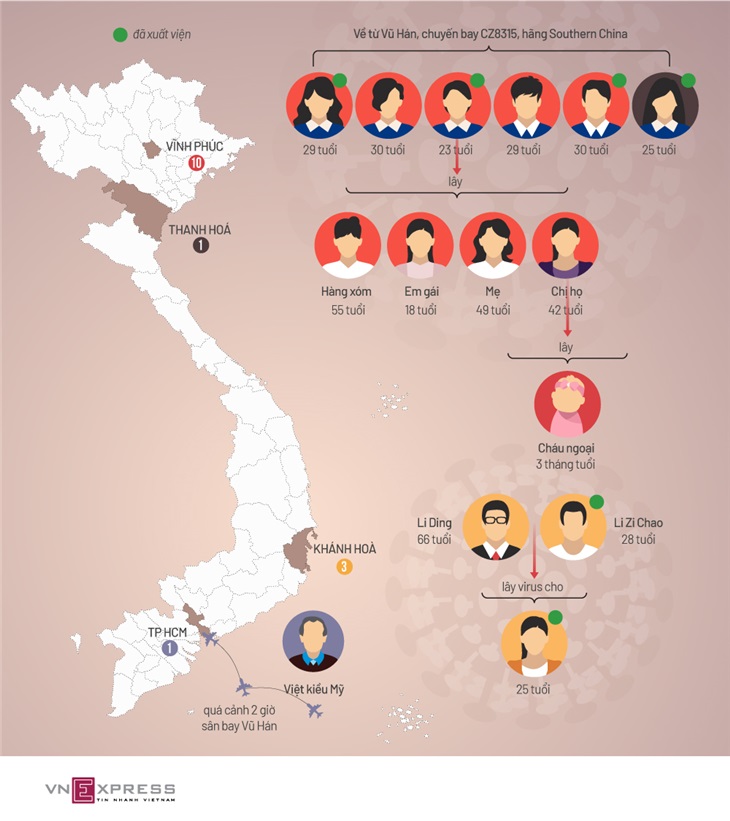 Đường lây của các ca dương tính nCoV ở Việt Nam. Đồ họa: Tiến Thành (Click vào hình để xem chi tiết)